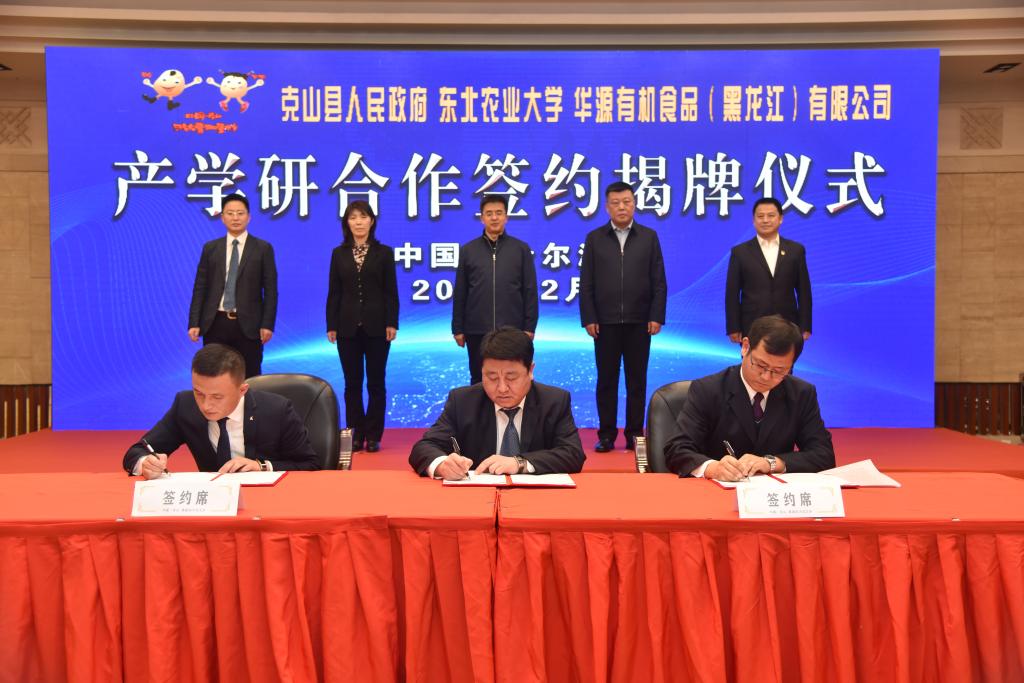 2月23日,我校与克山县人民政府、华源有机食品(黑龙江)有限公司合作签约揭牌仪式在华旗饭店国际会议中心隆重举行。我校副校长刘竹青,齐齐哈尔市科技局党组书记、局长黄静,克山县县长韩大勇,华源有机食品(黑龙江)有限公司董事长吴章祝出席会议。我校科技园与产业管理中心主任王磊、冠军白菜策略网cmp8论坛院长陈庆山等10位领导和专家,华源有机食品(黑龙江)有限公司企业相关负责人,克山县委组织部、县人才办等有关单位负责同志参加会议。会议由我校新农村发展研究院院长朱志猛主持。