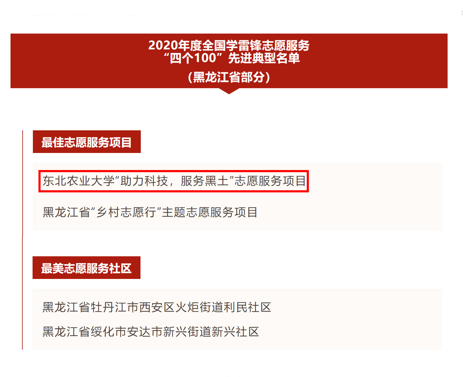 近日,中央宣传部、中央文明办等部门和单位共同组织开展了2020年度全国学雷锋志愿服务“四个100”先进典型宣传推选活动。我校冠军白菜策略网cmp8论坛“助力科技,服务黑土”志愿服务项目被评为全国学雷锋志愿服务先进典型“最佳志愿服务项目”,是我省高校唯一一个入选的志愿服务项目。
