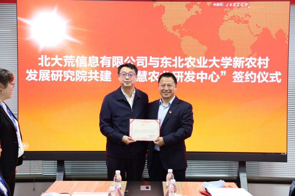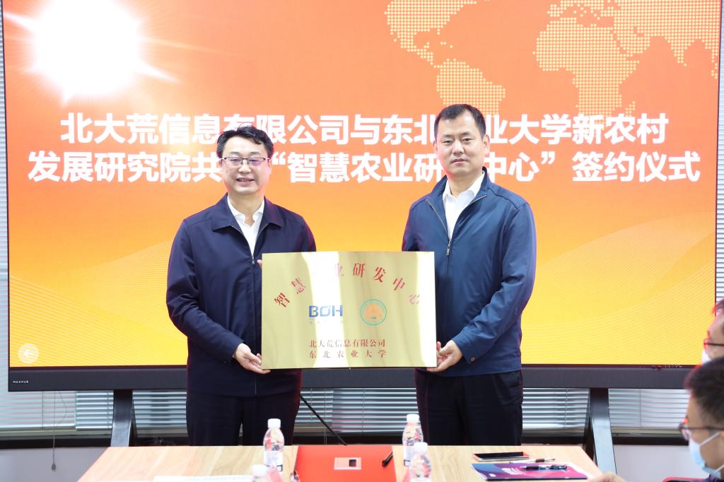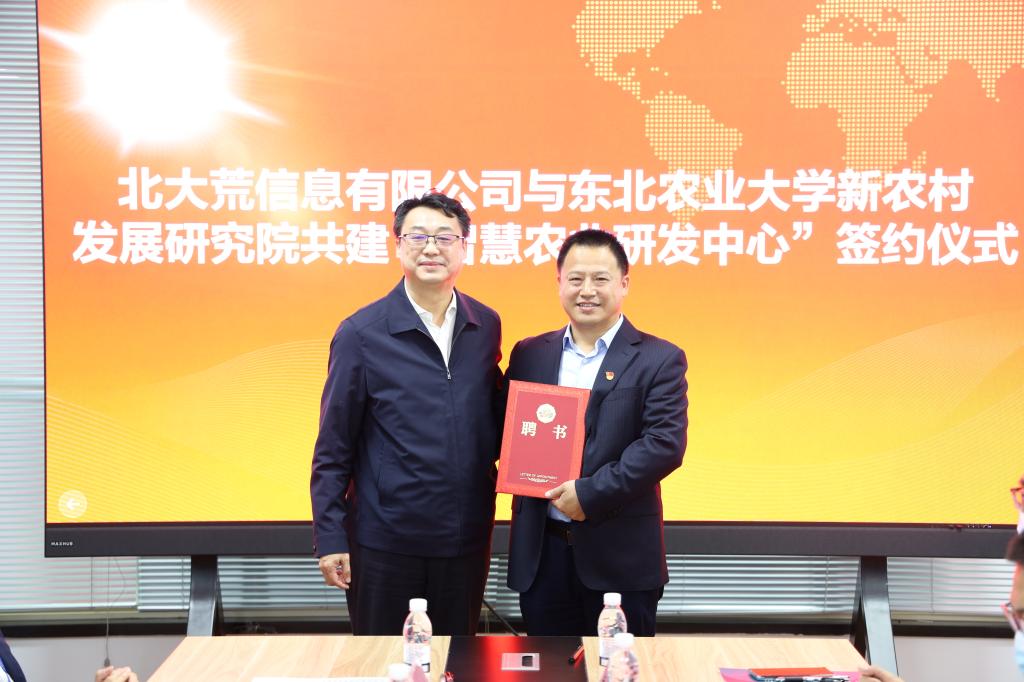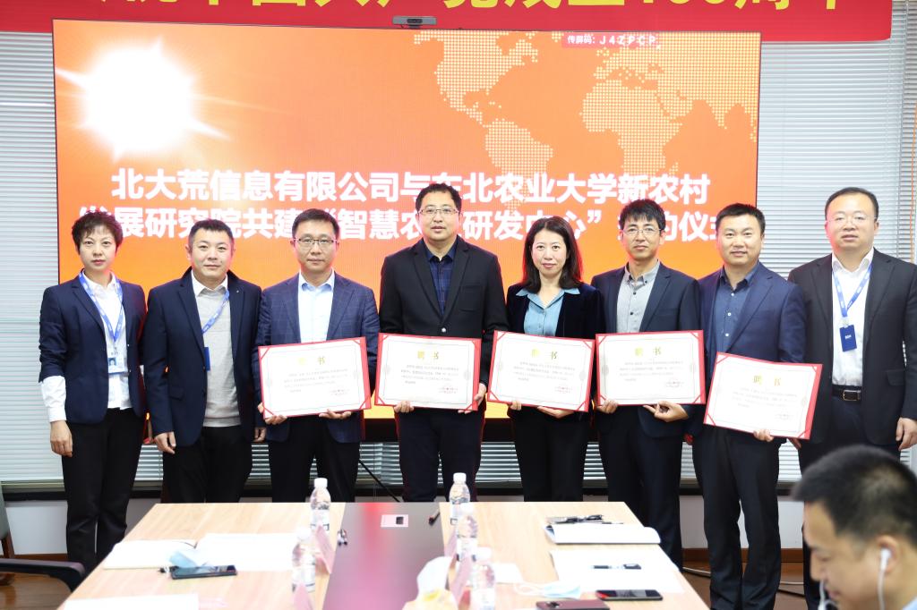 第二,针对“研发中心”,冠军白菜策略网cmp8论坛陈庆山院长与北大荒信息有限公司任荣荣副总经理就“研发中心”签订合作协议,东北农业大学新农村发展研究院朱志猛院长与北大荒信息有限公司张允海董事长为“研发中心”揭牌。张允海董事长为陈庆山院长颁发首席专家聘书,副总经理兰天义、罗广超两位副总经理和纪委书记徐洪波为东北农业大学智慧农业教师颁发聘书。
